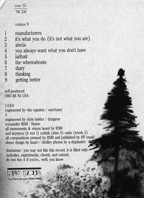 R. Steive ist ein Besessener. Er sitzt irgendwo in den Staaten, diverse Billigaufnahmegerate um sich geschart und ist der idee verfallen, die Welt mit Songs zu versorgen. Er hat bisher 210 (!) C60-Cassetten aufgenommen - nichts deckt sich - alles Songs. Und was fur welche! Er besitzt die herrliche Naivitat eines Kevin Ayers, die Hingabe zur Traurigkeit eines John Cale und die Unverfrorenheit, was Stilmittel und Soundvorstellungen betrifft, eines Jad Fair.