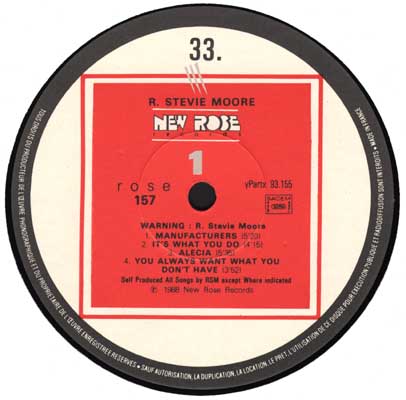 Like all of Moore's albums, this is a self-performed, self-produced, homemade release. While the sound here is sometimes tinny or muffled and the performing in places is haphazardly executed, there is a certain basement-brewed charm and cleverness afoot here that makes this record quite listenable. Highlights include "Jailbait," which sounds like a classic raw black blues number, complete with soundalike vocals and funky lyrics, but without the use of blues chordal progressions; the swallowed-up production values here help contribute to the illusion that this song was culled from a 1930's breakable 78. "Alicia" is an eccentric uptempo song with clear nods to White Album-era Beatles and the Bonzo Dog Band. "Whereabouts" is an acoustic country-pop tune with whining falsetto vocals that sometimes veer into out-of-tuneness. "Manufacturers" is a funky, almost danceable number full of chordal and arrangement surprises that has ironically cretinous lyrics delivered in a Barry White-style voice. There are two covers here, the better one being "Diary," the sentimental 1970s ditty by Bread; this comes off as a hilarious parody owing partly to the additions of a drum machine track, strangely timed crashing cymbals, and an earnestly exaggerated vocal delivery -- a real hoot. This is an inconsistent, if unusual and sometimes fun record to listen to.