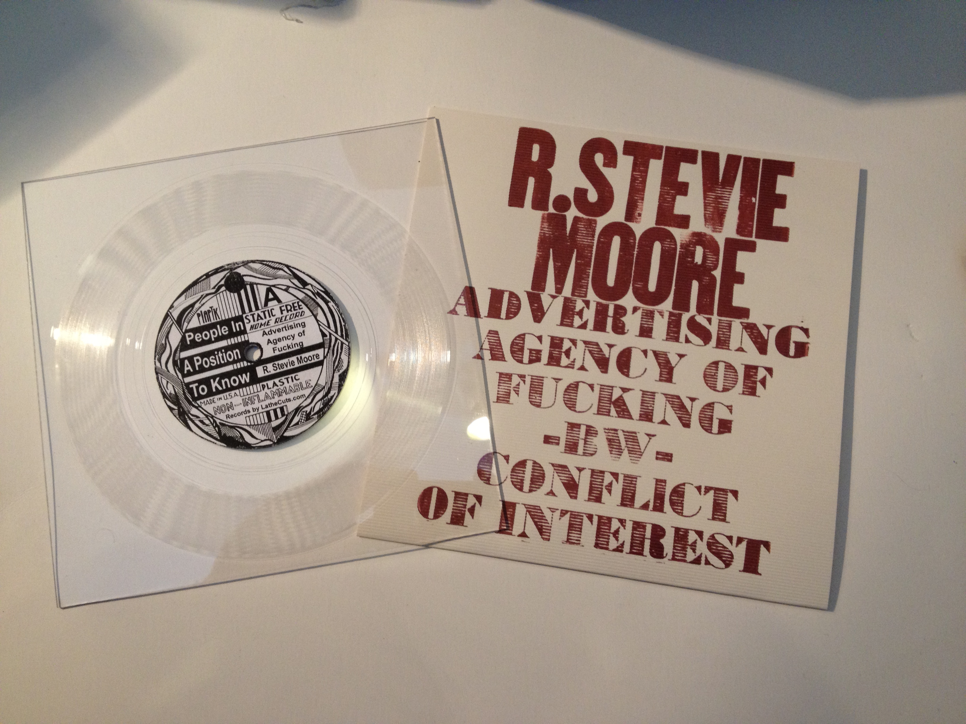 • "Advertising Agency of Fucking" b/w "Conflict of Interest" 7" clear square lathe cut, People In A Position To Know Records (US) RSMSSC-#1 (ltd ed of 78), 2012 INFO